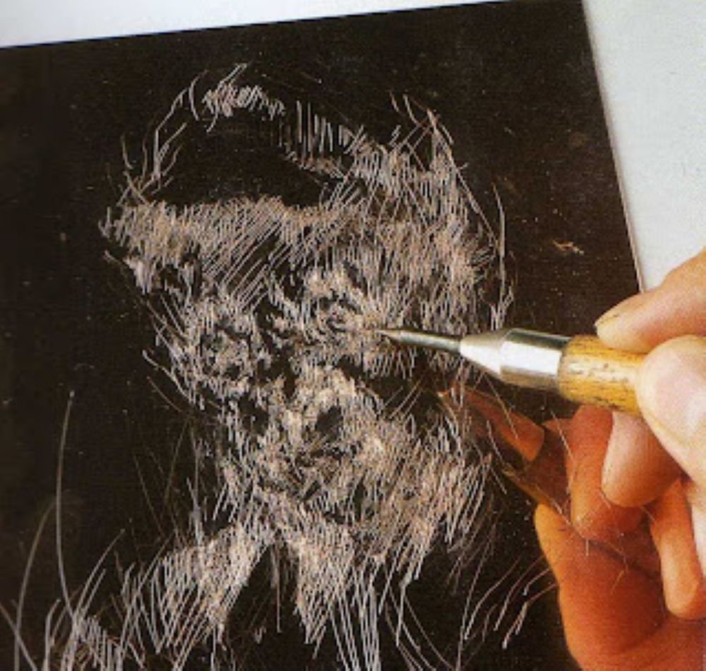 Se usan buriles y plancha de cobre, como en los casos precedentes. El calco es análogo. En cuanto a la punta de acero cortante, se apoya más o menos, según los efectos que se desee obtener. Al contacto de la punta, el cobre se levanta en los bordes. Estas barbas dan la intensidad de los tonos; hay, pues, que tener cuidado de no aplastarlas y de evitar que penetren en las huellas marcadas por el buril, lo cual exige una gran seguridad. Para obtener grises finos hay que quitar las barbas. Con objeto de darse cuenta de la progresión del trabajo se pasa un paño embebido con un poco de negro graso, de cuando en cuando, pues las pruebas de ensayo están proscritas, porque aplastan las barbas. El arte de grabar a punta seca requiere mucha destreza y gran seguridad de mano. La impresión es idéntica a la del grabado al buril.